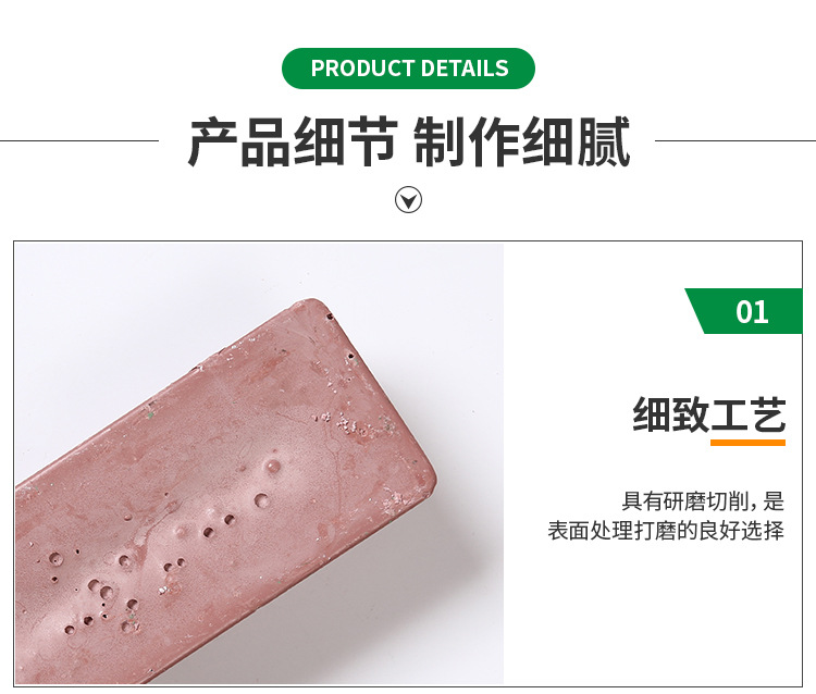不銹鋼衛浴拋光臘采用高強全樹脂砂布為原材料,采用體貼的人性化梯形長條造型在使用時更加稱心應手,使用高強粘度樹脂膠,產品質量穩定,外觀美觀。適用行業非常廣泛,可用于各類不銹鋼衛浴表面研磨、拋光,是衛浴表面處理打磨的良好選擇。